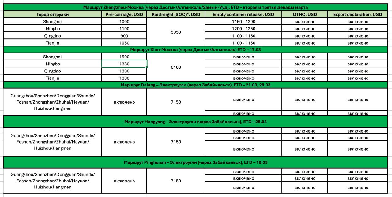 предоставление контейнера (стоимость см. в столбце «Empty container release», не включена в ж/д фрахт);
